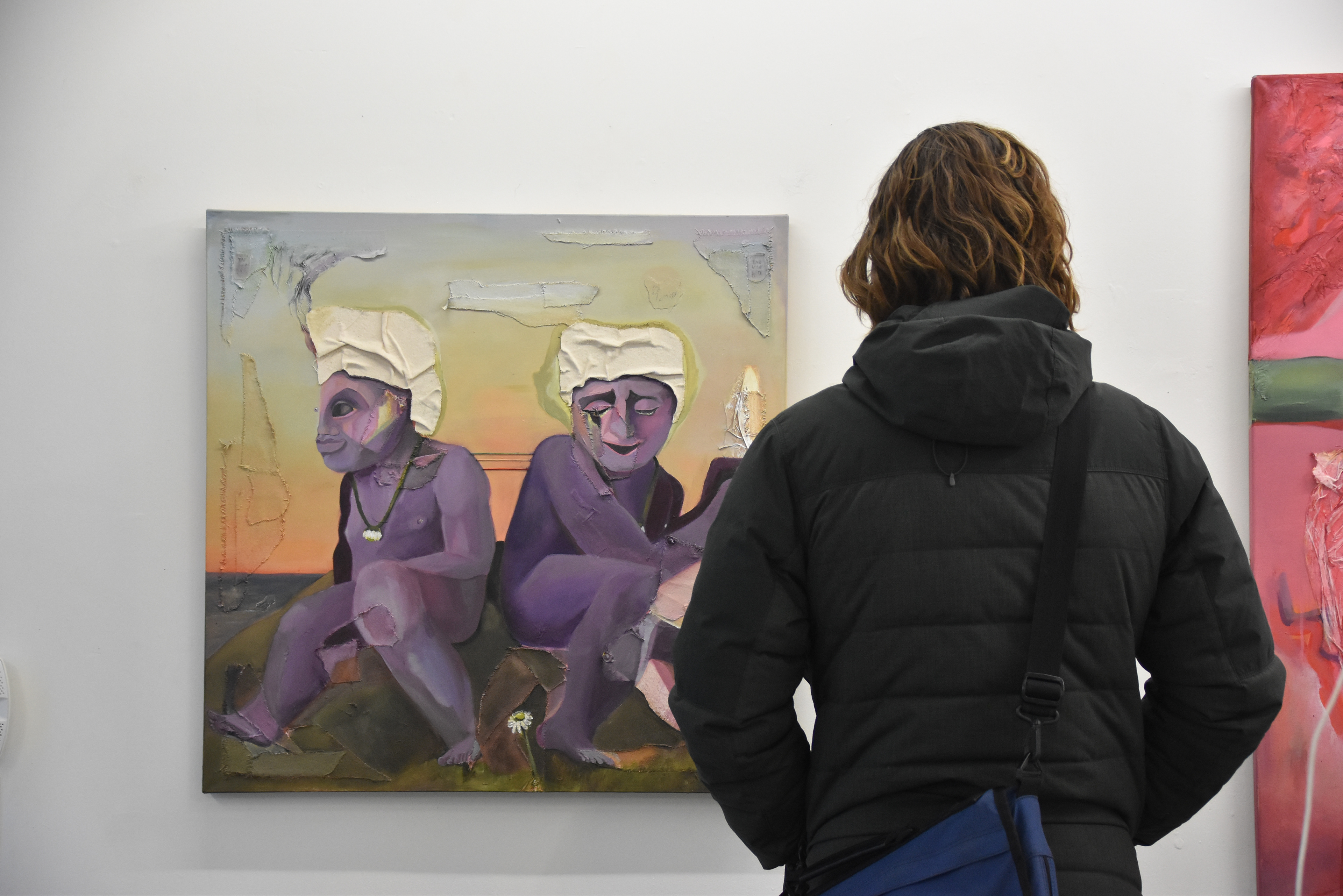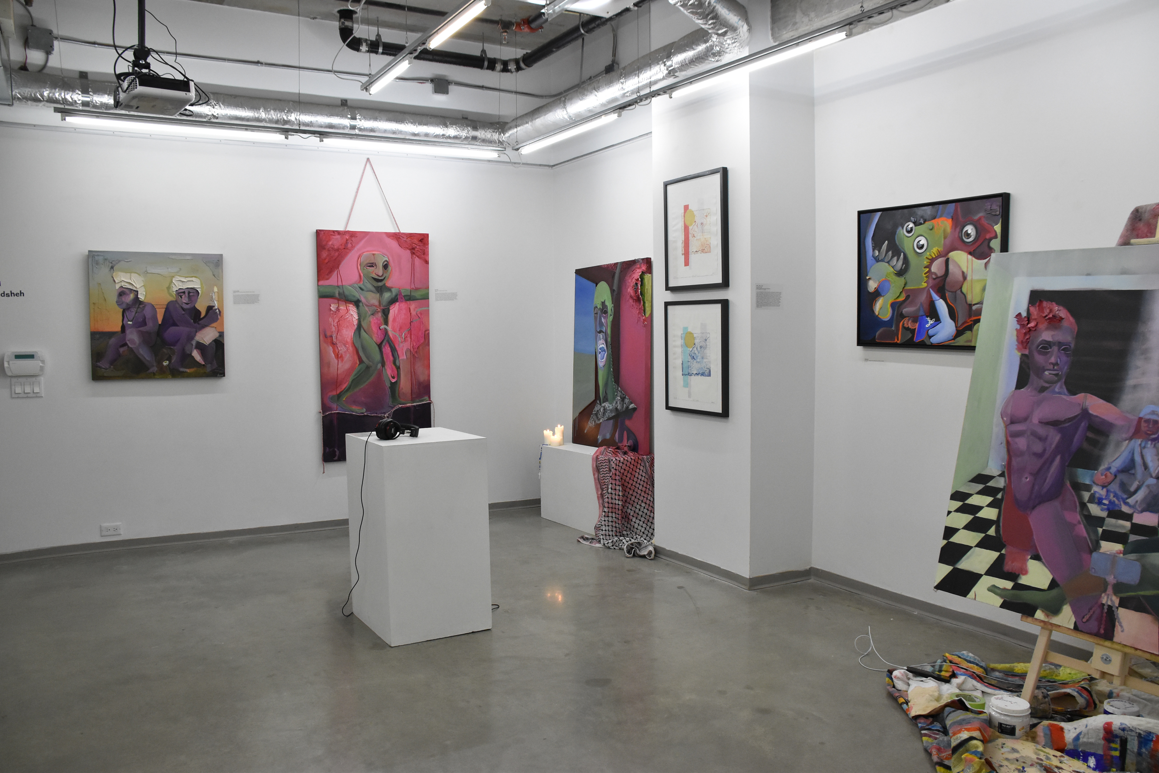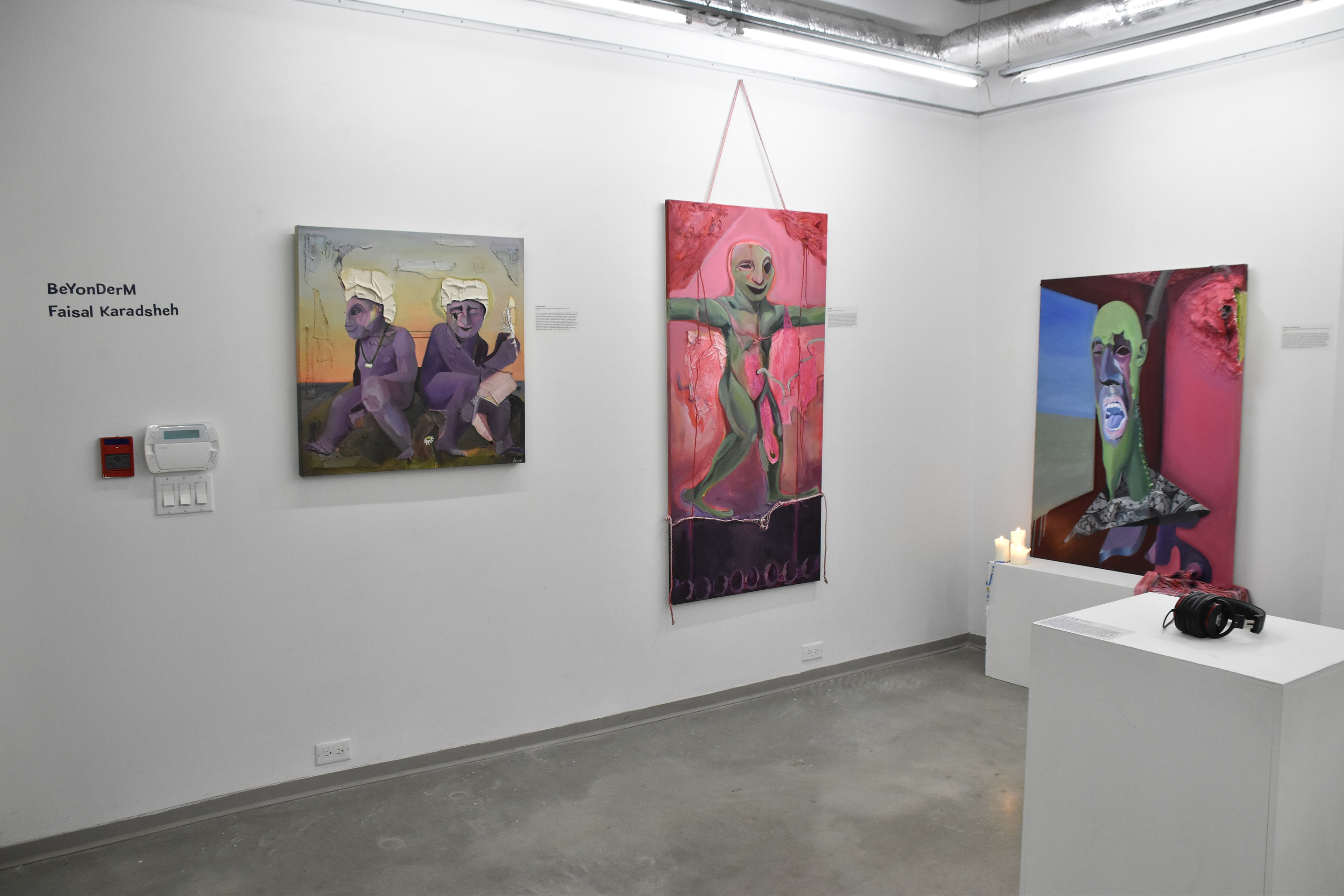 The exhibition showcased multilayered representations of the human body. Characters, both physically and conceptually, transcend humanist proportions. The body is stretched, shattered, stripped, and skinned—hollowed to become one with its surroundings. Androgynous, quasi-human, and in states of limbo, the foreground becomes background, inner and outer are interchangeable. Language becomes leaky, skin porous, and categories ambiguous. The title itself, BeYonDerM, assumes various intonations: Be, Beyond, Yonder, Dermis. The blending of words and the dissolution of their boundaries create a new term, unapologetically non-rational.