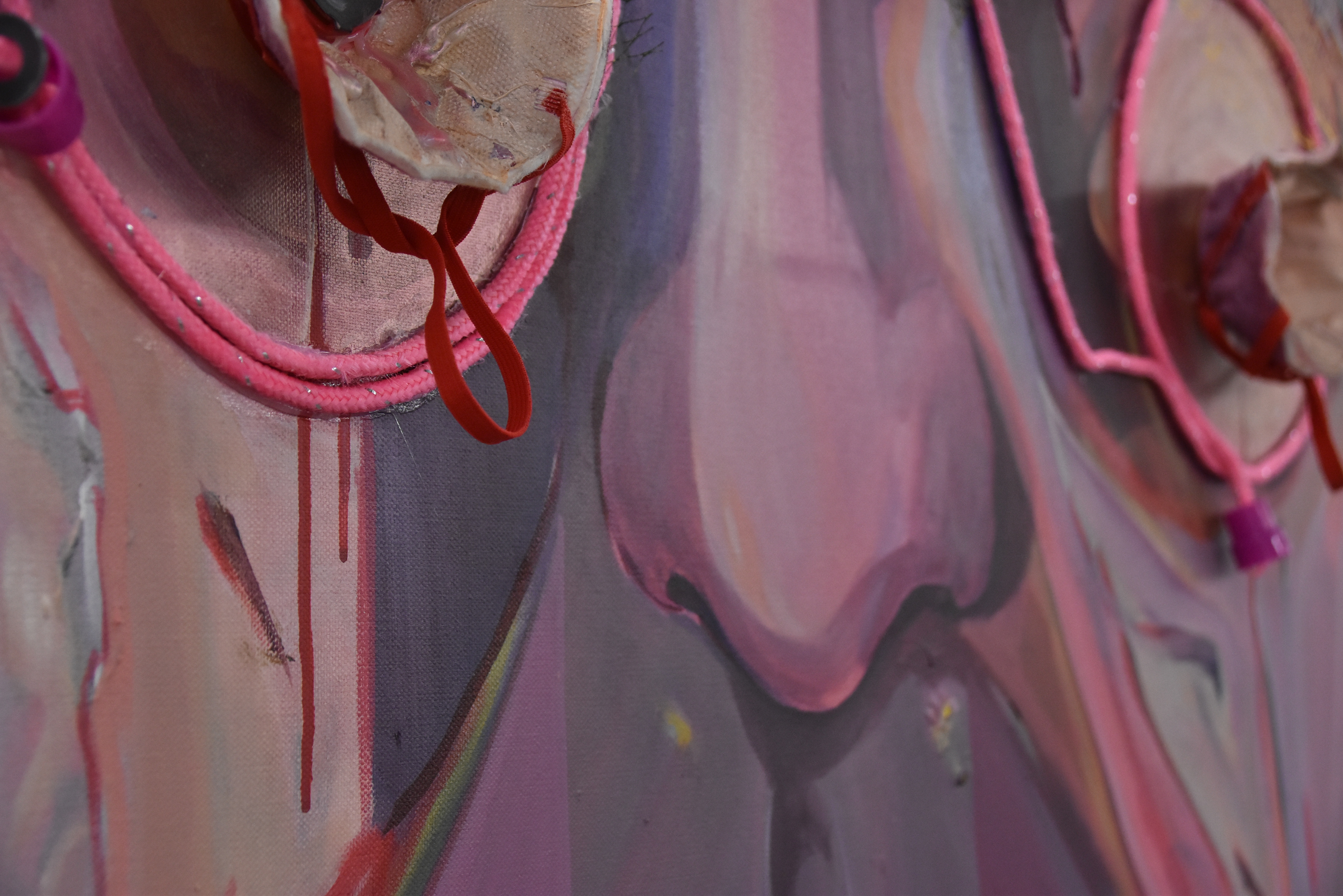 (10). Synth (2022), N-95 masks, plastic mesh bags, pink jumping rope, PVA, washi paper, iridescent paint, acrylic on canvas, 4ft x 2ft