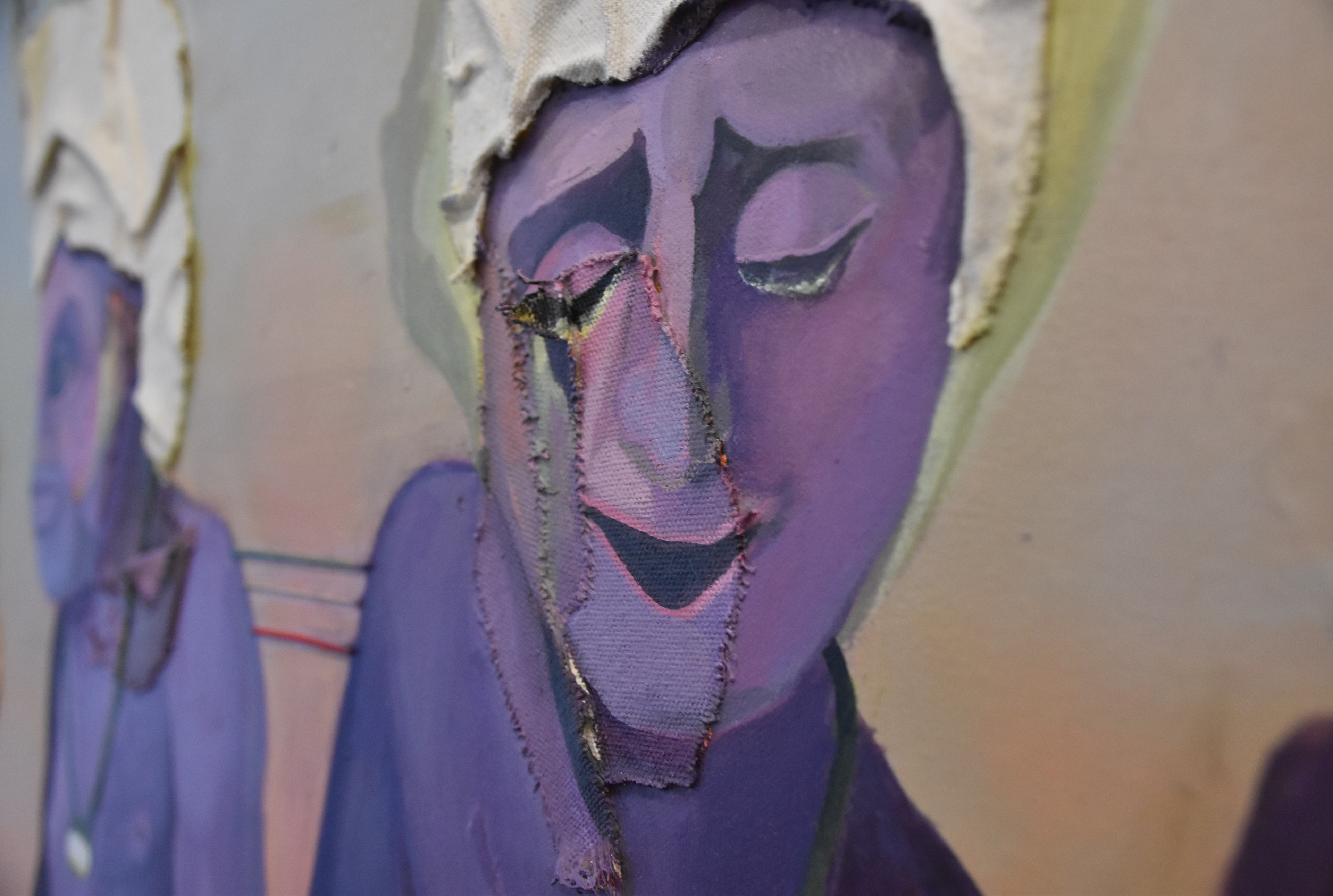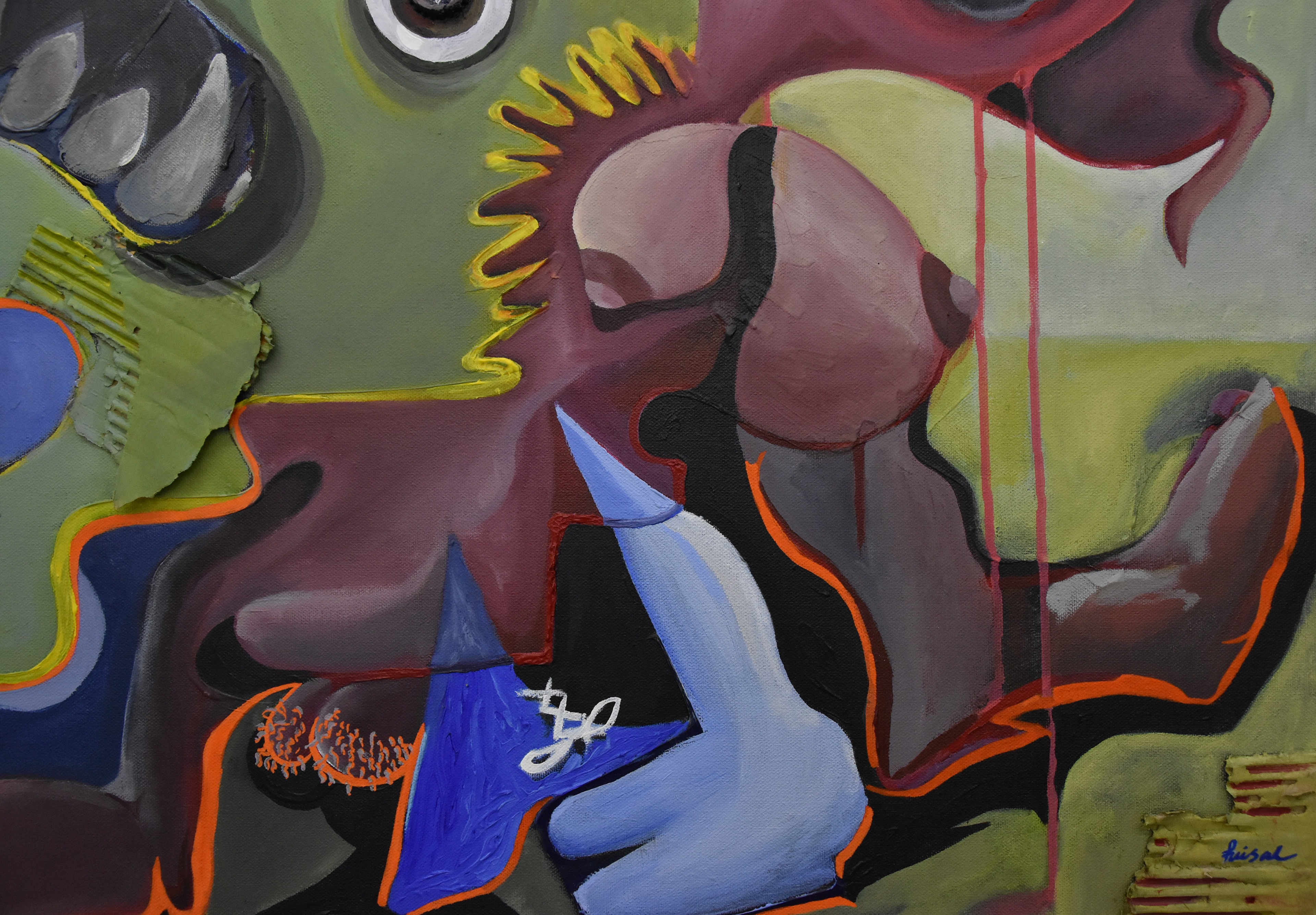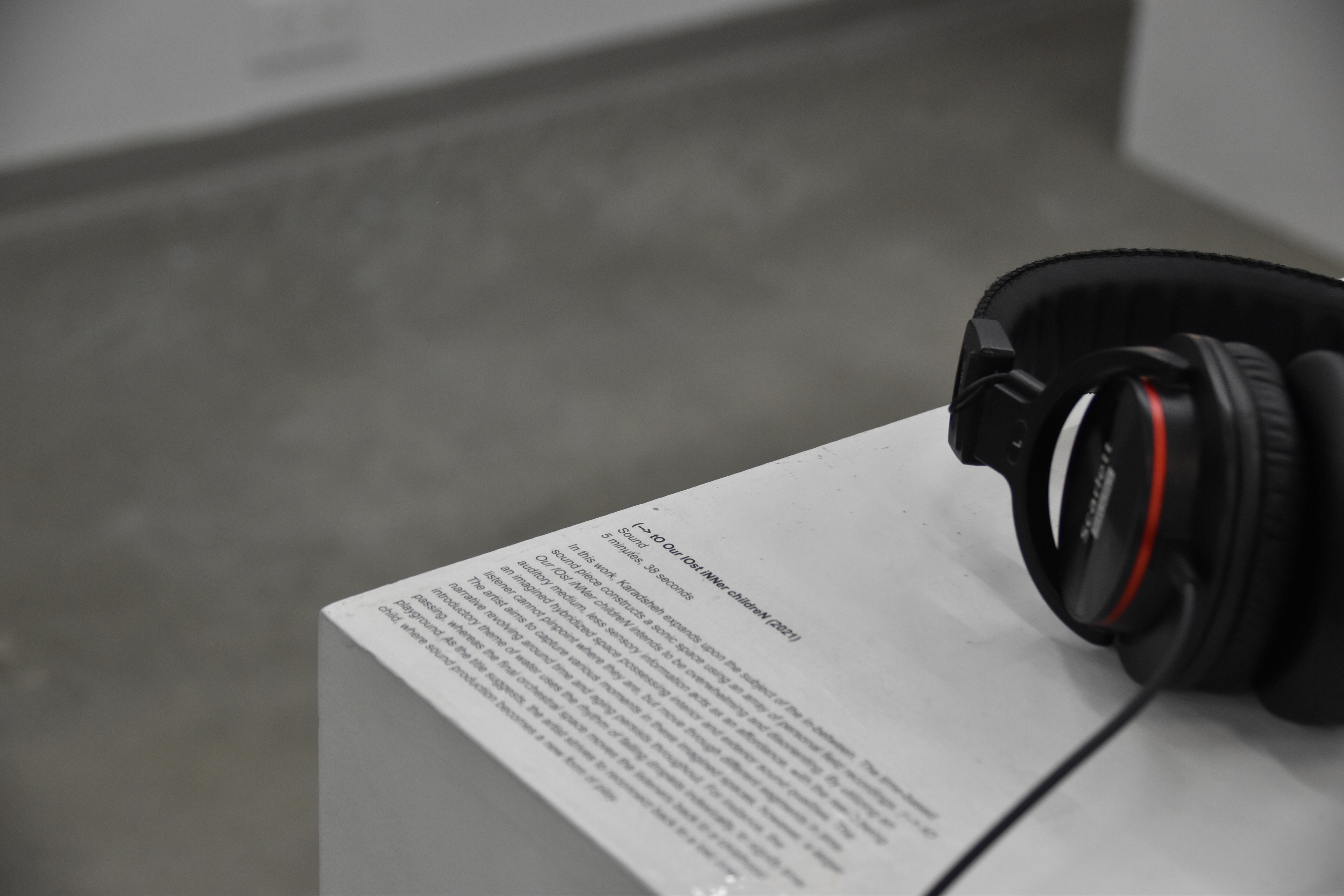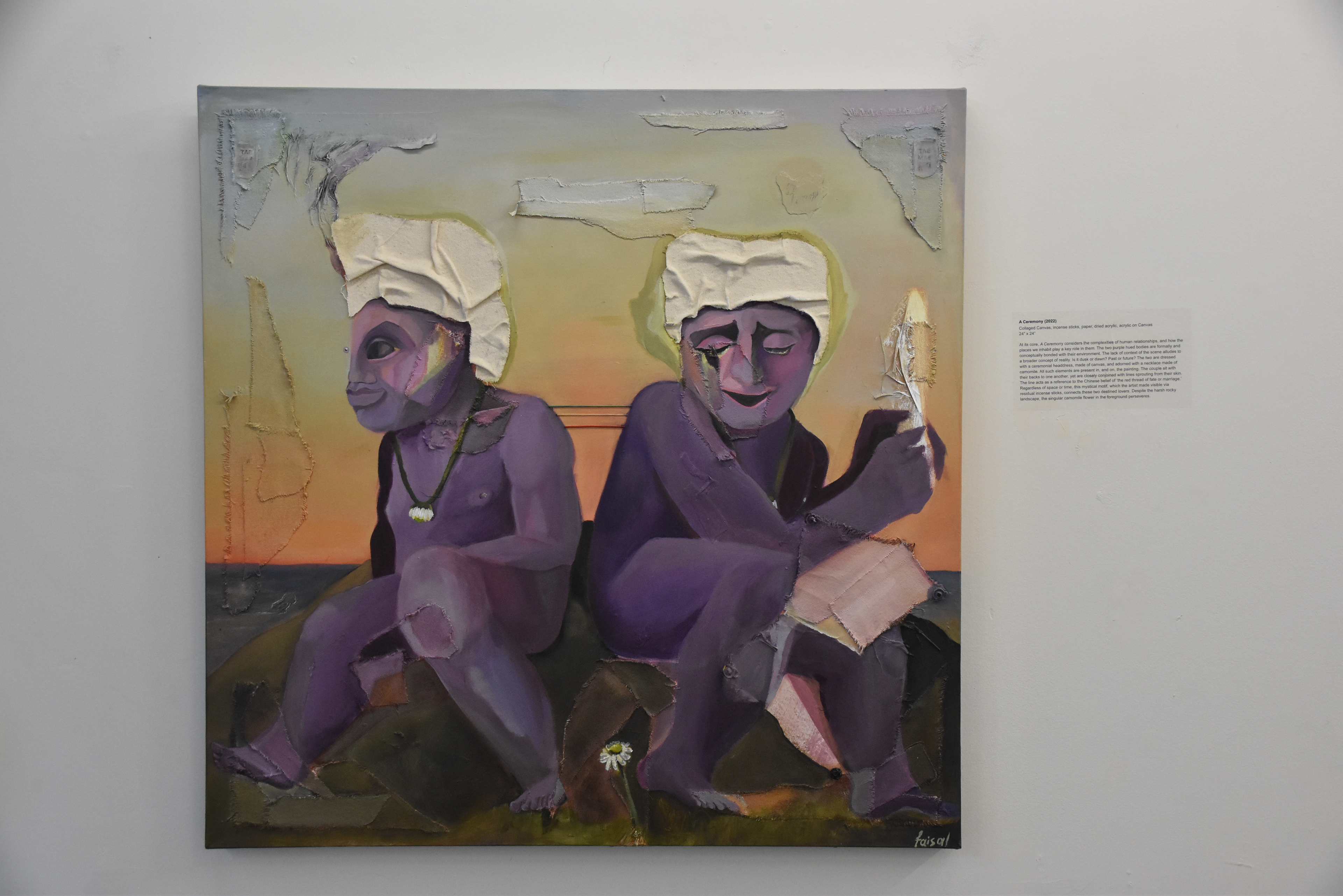 Additional works like Past-ing Time, Palestine (2021) and the two intaglio prints, الشمس والنفس / The Sun and the Self (2019), delve into the realities of the Palestinian diaspora, in conjunction with my own personal journey of Palestinian identity exploration. A Ceremony (2022) and Push (2022), hung next to one another at the beginning of the exhibition, contemplate notions of birth—be it the birth of bodies, relationships, or time. At the heart of the exhibition lies tO Our lOst iNNer childreN (2021). This centrifugal sound work invites listeners to engage with the pieces from various vantage points. It serves to converse with the paintings as it sonically probes the nexus between inner and outer spaces. The listener is guided through temporal shifts and indeterminate locations. Sound perforates the painted body, leaving one with disassembled parts.